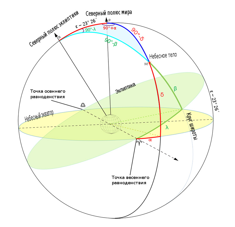 Основные точки эклиптики определяются небесным экватором. Он «разрезает» сферу на 2 части, и когда Солнце проходит через эти координаты, наступает зимнее (в созвездии Козерог) или летнее (в созвездии Рак) солнцестояние.