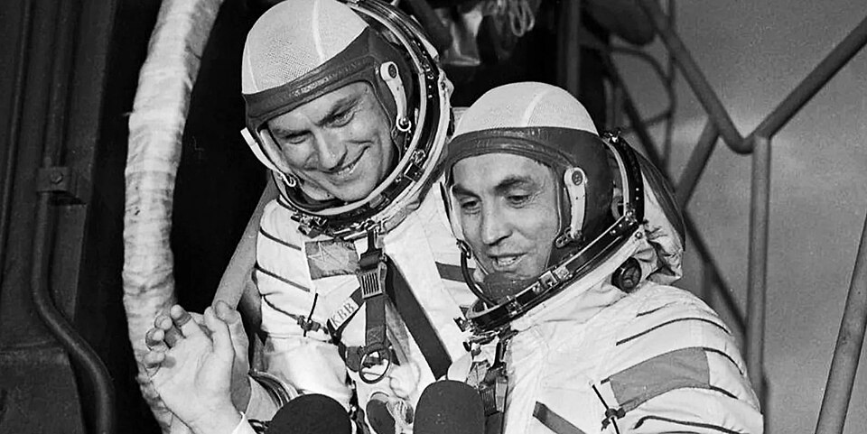 Владимир Коваленок (слева) и Александр Иванченков дают интервью перед стартом, июнь1978.
