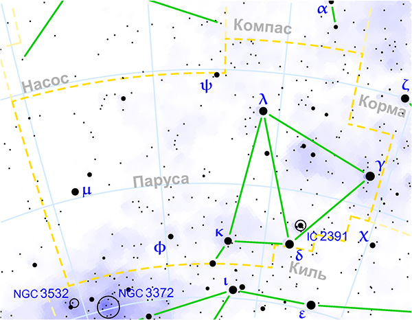Это одно из самых молодых созвездий – до середины 18 века оно было частью более крупной звездной фигуры Арго. И лишь в 1752 году получило «независимость», когда французский астроном Лакайль разделили Арго на три отдельные фигуры.